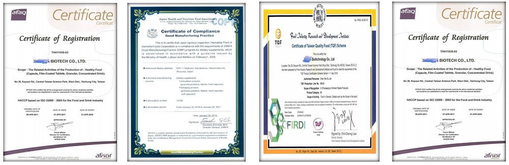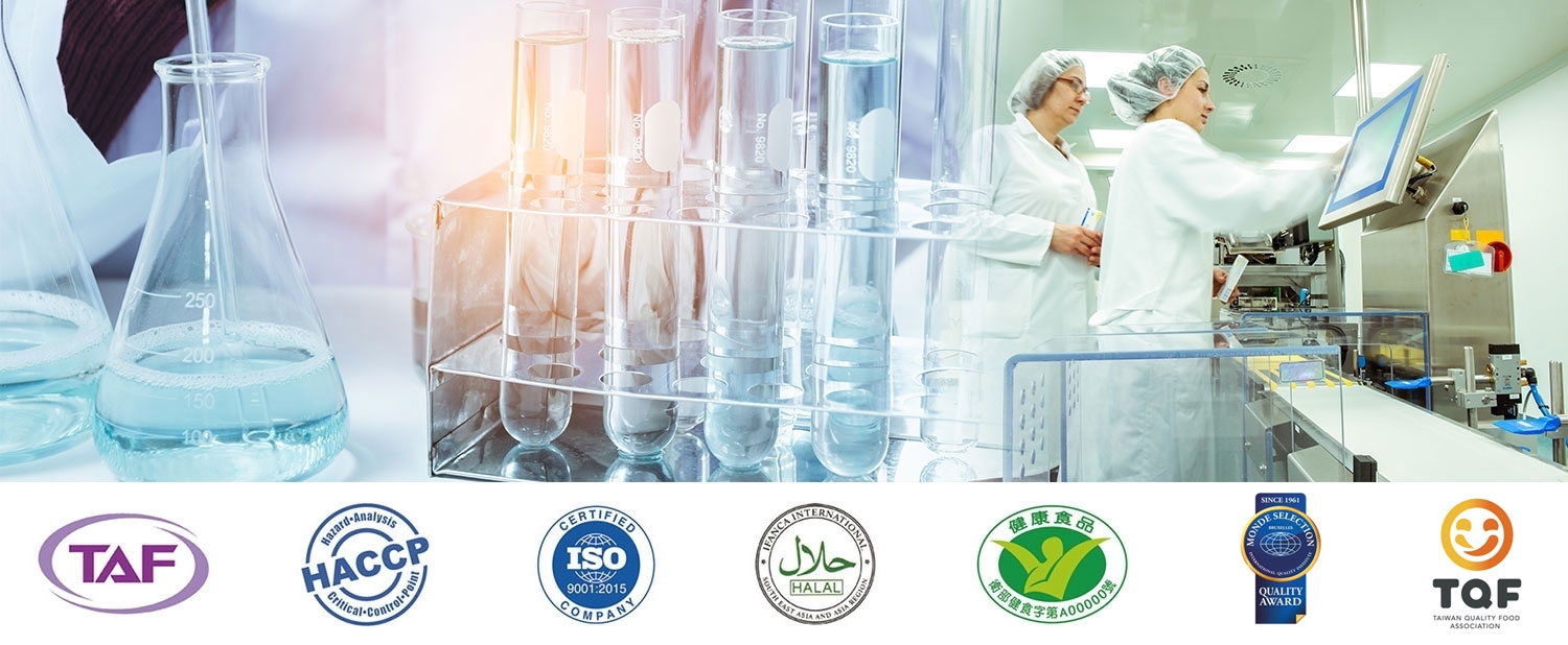台德生醫的生產中心,生產中心不僅榮獲ISO/ HACCP國際認證,更提升設置醫藥等級國際TAF認證實驗室。所有人員、原物料進出皆須經過嚴格管控,維持作業廠區環境品質。此高規格管理更是協助客戶完成多種認證的基礎,包括台灣健康食品認證、國家品質SNQ認證、清真食品認證、中國食品審批認證、國際Monde Selection品質獎等。